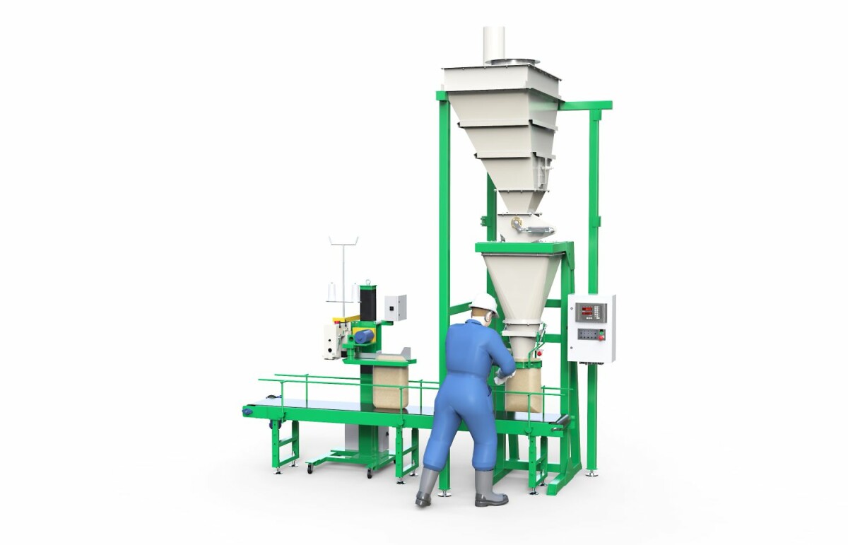 Линия позволяет расфасовывать хорошо сыпучие продукты в открытые мешки до 10 кг. Обслуживает линию оператор фасовки и рабочий укладки заполненных мешков на поддон.