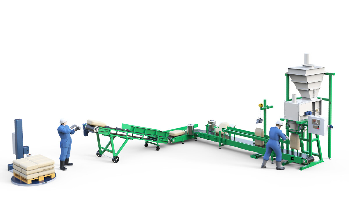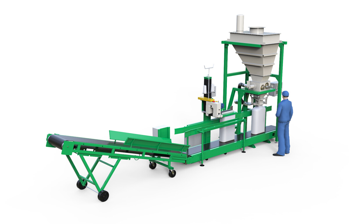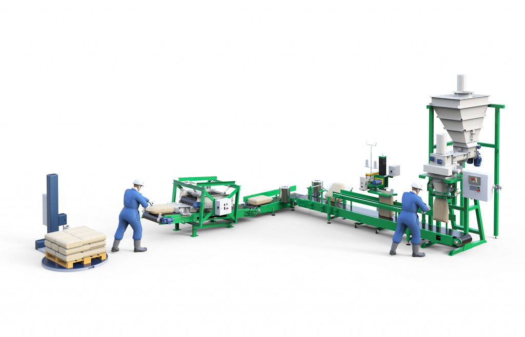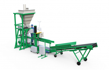 Линия позволяет расфасовывать различные типы сыпучих продуктов в открытые мешки до 50 кг. Обслуживает линию оператор фасовки и рабочий укладки заполненных мешков на поддон.