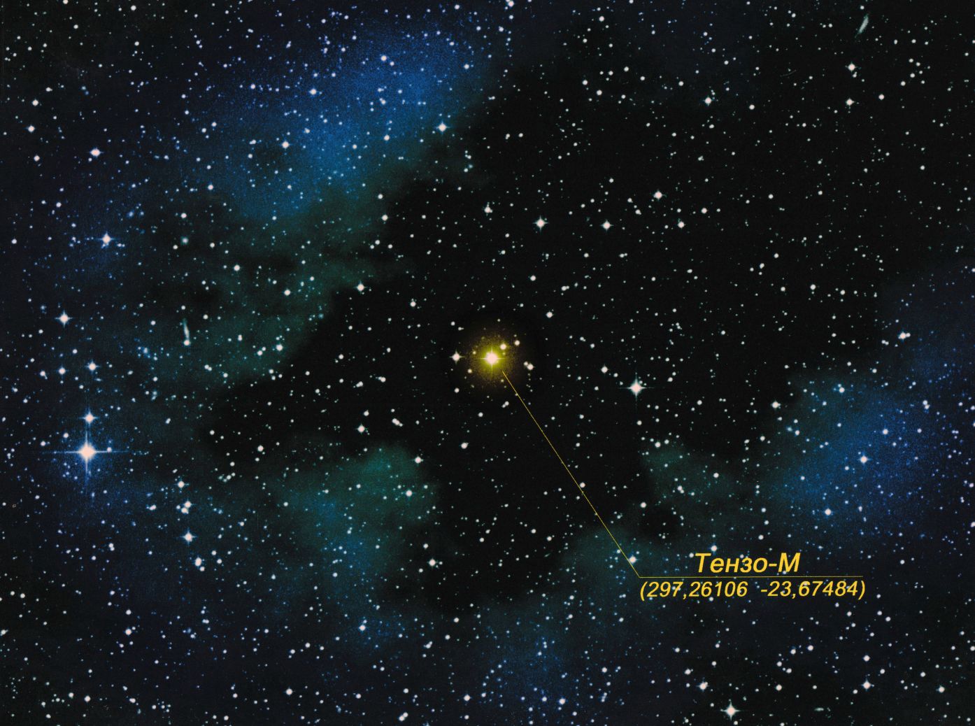 Это звезда 16-той величины в созвездии Стрельца. В Стрельце находятся точка зимнего солнцестояния, а также центр Галактики, удалённый от нас примерно на 30 000 световых лет и скрытый за облаками межзвездной пыли! Счастливые обладатели телескопов могут найти звезду «Тензо-М» по координатам: 297,26106 – 23,67484.