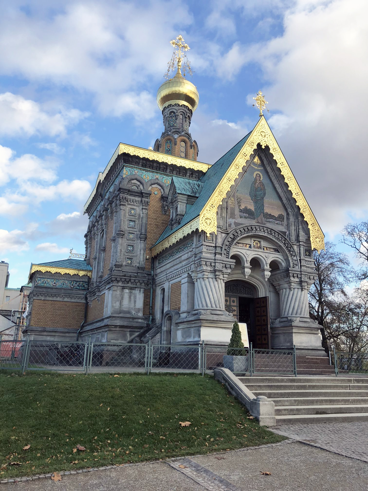 Посещение делегацией «ТЕНЗО-М» города Дармштадта (Германия), в котором вот уже 68 лет успешно работает мировой лидер в области разработки и производства средств измерения механических величин – фирма НВМ, в день прилета из Москвы на этот раз началось с похода в Православную Церковь Св. Магдалены. Храм был построен в раннем ярославском стиле на личные средства последнего русского Императора Николая II и Императрицы Александры Федоровны (Принцессы Аликс Гессен-Дармштадской). Стоит она на земле, привезенной в Германию из России и собранной со всех губерний. С 1981 года, когда члены царской семьи были причислены к лику Новомученников и Исповедников Российских, в день их смерти (4/17 июля) в храме проводится архиерейское служение с Царственным молебном.