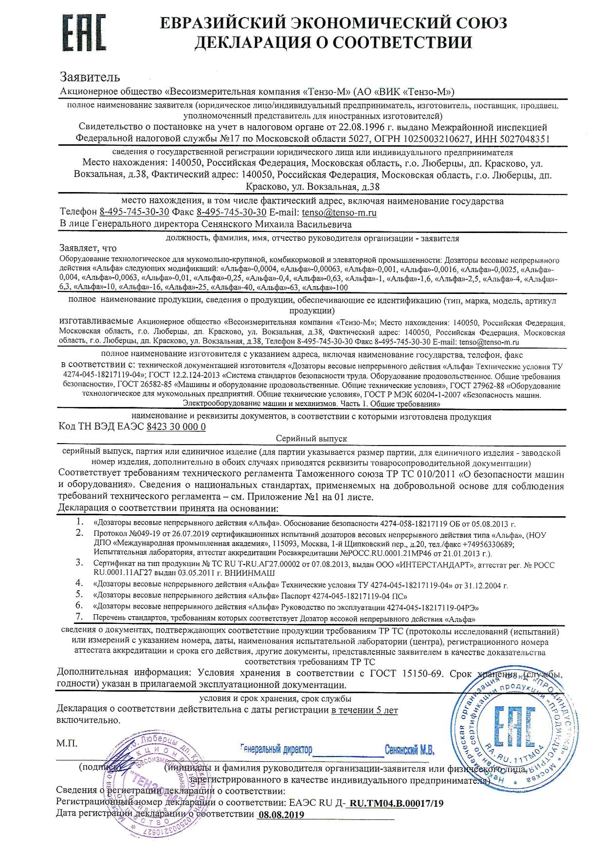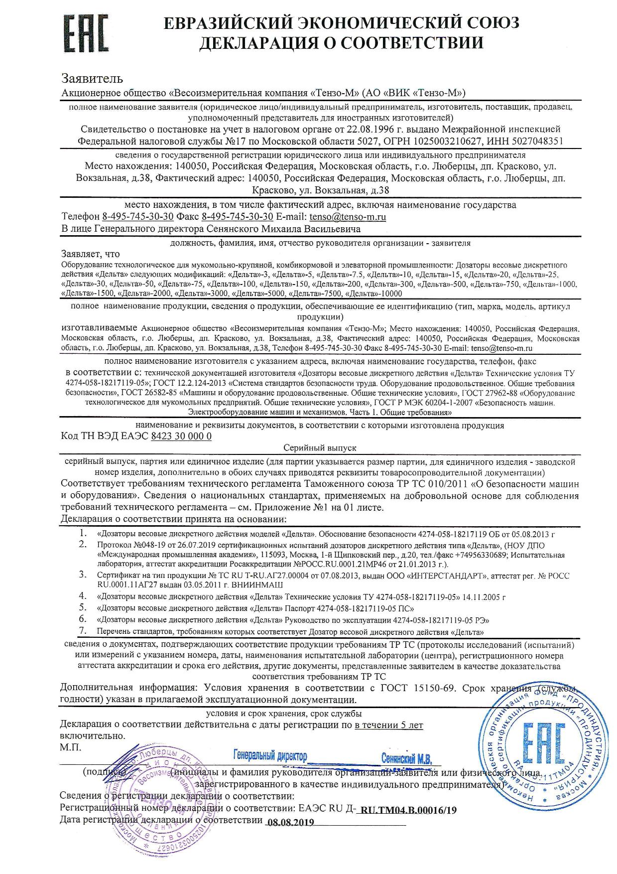 В результате успешного прохождения испытаний бункерные весы «Поток», весовые дозаторы дискретного действия «Гамма» и «Дельта», а также весовые дозаторы непрерывного действия «Альфа» получили сертификаты соответствия и декларации о соответствии требованиям данного регламента.