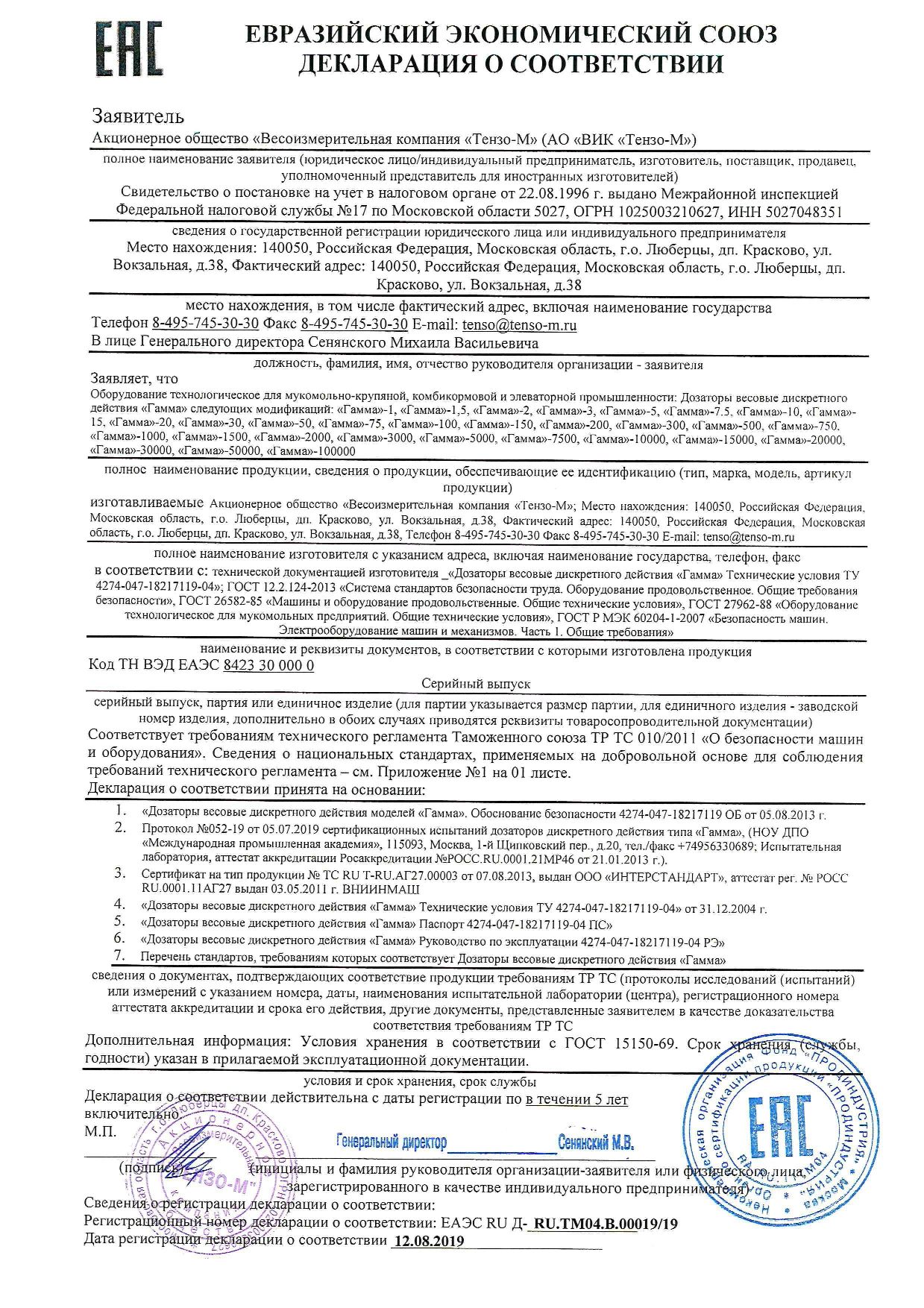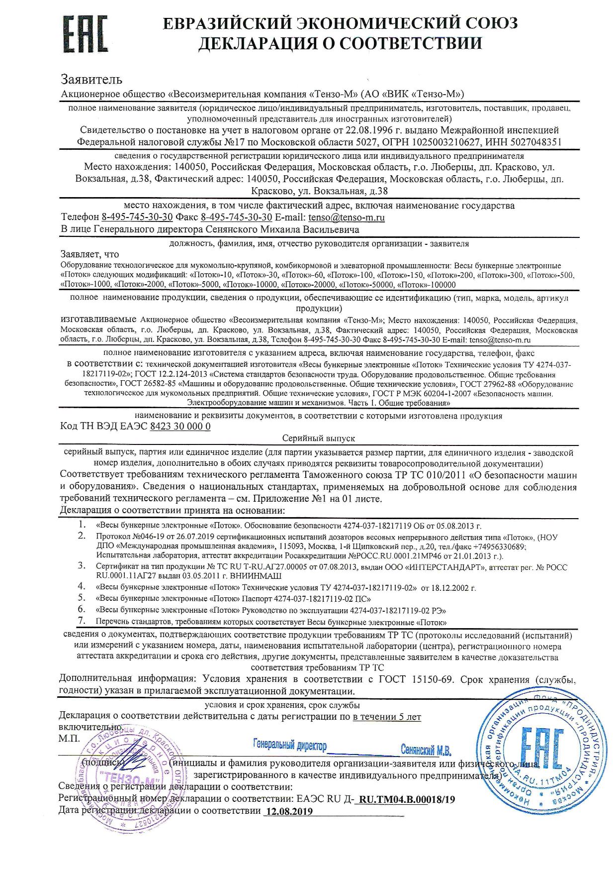 Бункерные весы и дозаторы «Тензо-М» соответствуют требованиям Технического регламента Таможенного союза