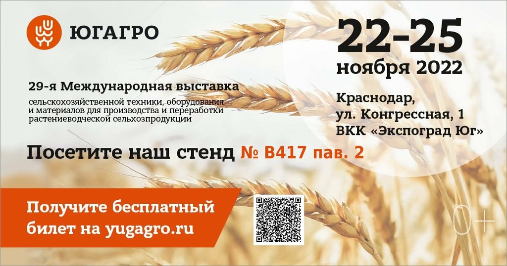С 22 ноября по 25 ноября 2022 года «Тензо-М» примет участие в 29-й Международной выставке сельскохозяйственной техники, оборудования и материалов для производства и переработки растениеводческой сельхозпродукции «ЮГАГРО». Мероприятие традиционно пройдет в Краснодаре, в ВКК «Экспоград Юг». Приглашаем посетить наш стенд № B417 в павильоне № 2.