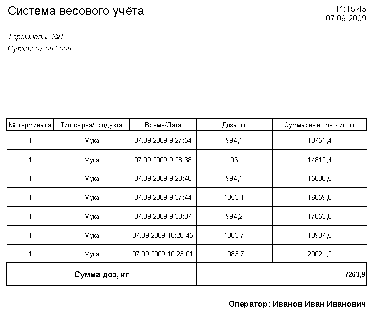 Каждому модулю, работающему с оборудованием, соответствует свой модуль для генерации отчета. Просмотр и печать отчетов за предыдущие периоды осуществляется без остановки взвешивания.