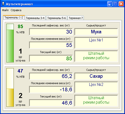В режиме реального времени программа может отображать следующие данные для каждого весового терминала: