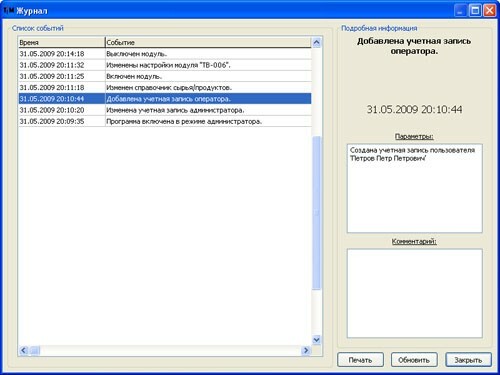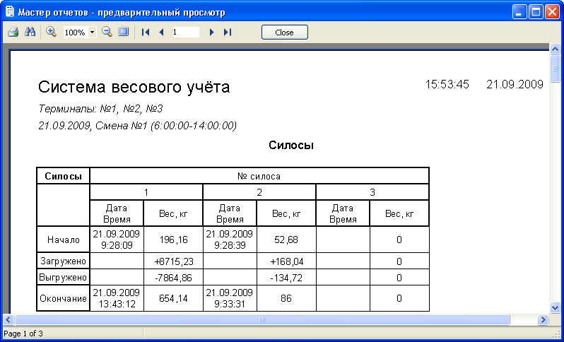 Каждому модулю, работающему с оборудованием, соответствует свой модуль для генерации отчета. Просмотр и печать отчетов за предыдущие периоды осуществляется без остановки взвешивания.