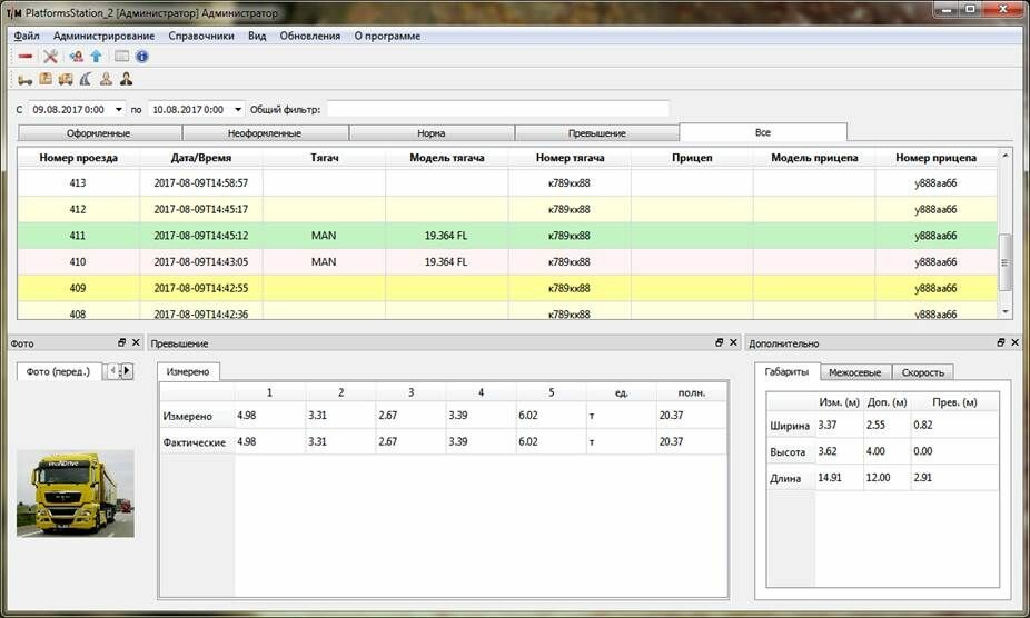 Принцип работы программы достаточно прост. Оператор взвешивает транспортное средство по осям на автомобильных весах ВА-П, ВА-Д или «АВИОН», заносит информацию о номере, фиксирует фото с IP-камеры в весовую программу, а затем передает данные в PlatfromsStation одной кнопкой. Далее, происходит процесс оформления и расчета перегруза ТС. Удобная цветовая палитра табличной части программы поможет сориентироваться – где есть перегруз, а где нет. Программа PlatfromsStation обладает функцией ввода весовых нагрузок вручную, что дает возможность использовать данное ПО с любым весовым оборудованием, не поддерживающим автоматический перенос данных по TCP/IP. Система справочников ПО PlatfrormStation позволяет вести базу данных ТС, водителей, контрагентов и другой номенклатуры для будущего их использования без повторного ввода, и вместе с оформлением взвешивания «на лету» – в разы ускоряет процесс оформления проезда. Подробная система логов и возможность заведения отдельных пользователей-операторов позволяет контролировать процесс работы ПО в постоянном режиме и сводит к минимуму возможные сбои и ошибки, основанные на человеческом факторе.