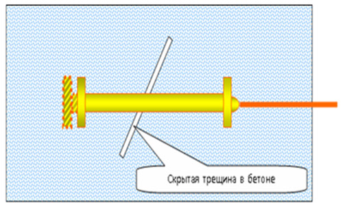 Рис. 13. Работа тензометра при наличии скрытой трещины. |