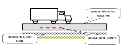 Для измерения деформаций дороги при проезде автомобиля закладные тензометры могут быть размещены в толще дорожной одежды, как это показано на рис. 9 [5].