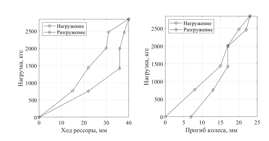 Рис.8. Диаграммы вертикального хода рессоры и деформации шин заднего колеса в процессах нагружения и разгружения