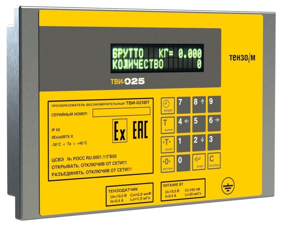 По статистике, каждый пятый заказчик желает взвешивать и дозировать во взрывоопасных условиях или средах! Это очень непростая задача, поскольку требует не только разработки таких терминалов, но, что гораздо сложнее, проведения их сертификации в аккредитованной организации! Серия таких приборов с индексами ТВИ - 024 и 025 (рис.3) была разработана и сертифицирована для использования в сложных условиях шахт, газовых хранилищ, баз нефтепродуктов и бензоколонок! Эти приборы имеют особый «боевой раскрас» – яркую желтую лицевую панель и могут быть использованы в составе платформенных, автомобильных, вагонных, бункерных или других весов, а также систем в соответствии с требованиями их паспорта и руководства по эксплуатации.